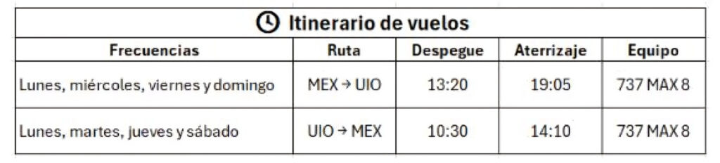Además, Zapata destacó las ventajas del itinerario programado. Los vuelos operarán los días lunes, martes, jueves y sábado saliendo desde Quito, lo que permitirá conectar a cualquiera de los 100 destinos que ofrece Aeroméxico en su red doméstica e internacional. Esta frecuencia garantiza flexibilidad para diferentes tipos de viajeros.