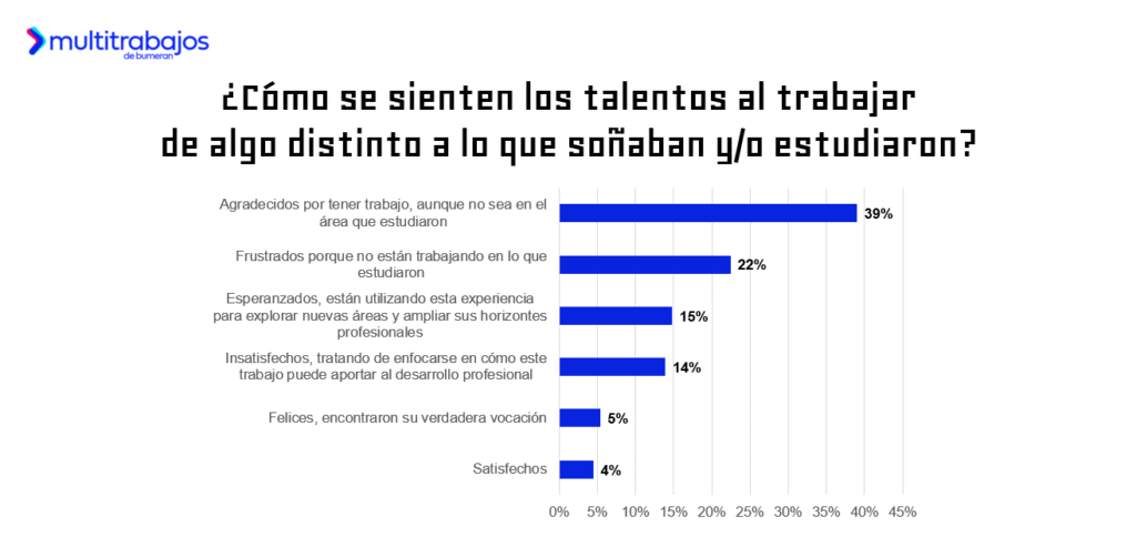 Sin embargo, el 36% de los encuestados manifestó sentirse frustrado. Esta frustración proviene de la imposibilidad de desarrollarse en el área que anhelaban, aunque muchos tratan de resignificar sus labores actuales.