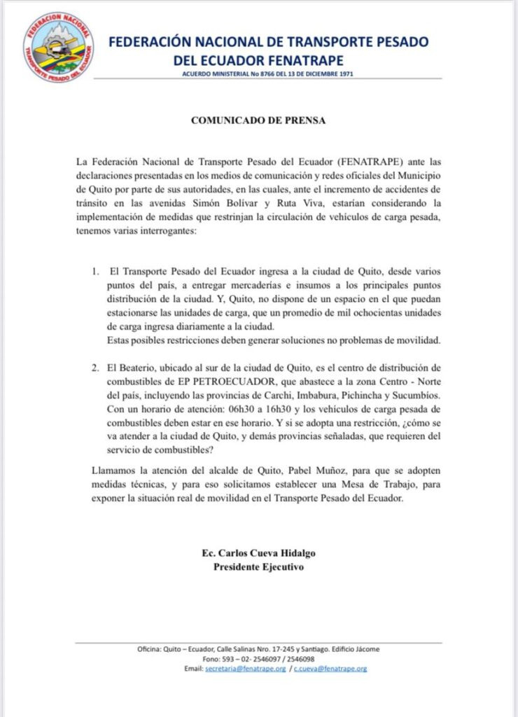 Según cifras del gremio, 1.800 camiones ingresan diariamente a la ciudad desde distintas provincias del país, sin que existan espacios adecuados para estacionamiento o descarga. “Estas posibles restricciones deben generar soluciones, no problemas de movilidad”, subrayó Cueva, en nombre de la Federación de Transporte Pesado.