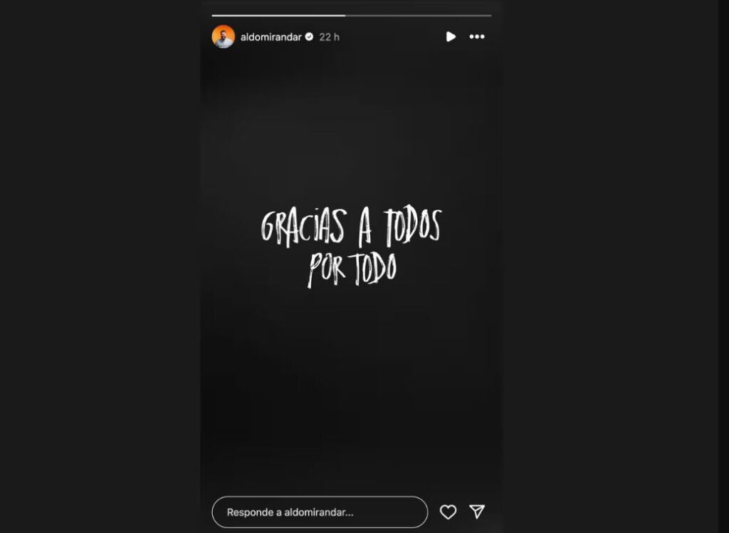Horas antes de conocerse la noticia, Aldo Miranda, de 32 años, publicó una historia en Instagram que preocupó a su comunidad digital. Con un fondo negro y letras blancas, escribió: “Gracias a todos por todo”. Este mensaje fue interpretado por muchos como una despedida, un presagio de que algo no estaba bien.