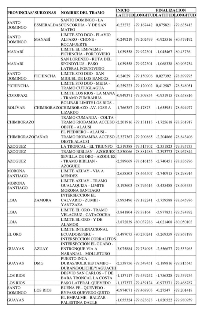 Según el Acuerdo Ministerial 25-19-ACU, la primera fase de esta política contempla la intervención en 25 tramos viales distribuidos en 13 provincias del Ecuador. Las zonas seleccionadas han sido categorizadas como “áreas prioritarias” debido a su alta carga vehicular, siniestralidad y necesidad de mayor presencia estatal.