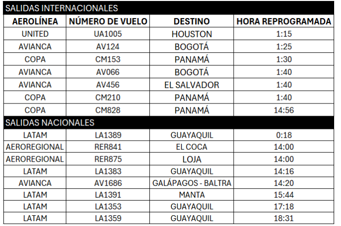 La Corporación Quiport compartió el listado de vuelos reprogramados para esta fecha. Este fue elaborado con la información proporcionada por cada aerolínea. Se recomienda a los pasajeros verificar directamente con su aerolínea el estado actualizado de su vuelo antes de acudir al aeropuerto. Esto ayudará a confirmar horarios de salida o posibles cambios. Los contactos de cada aerolínea están disponibles en el siguiente enlace: