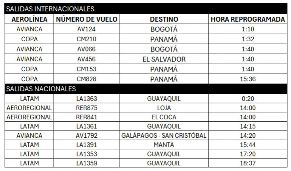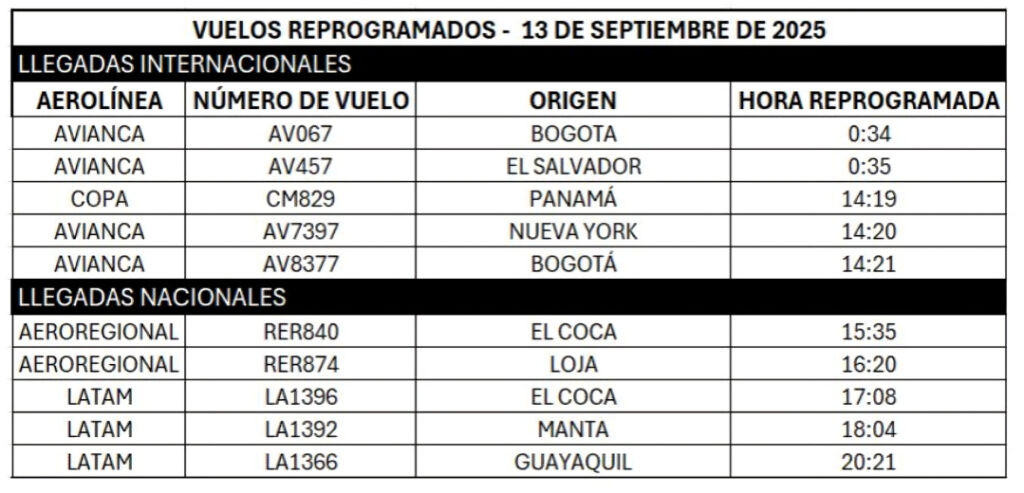 Corporación Quiport elaboró el listado de vuelos afectados con base en la información proporcionada por cada aerolínea. Los pasajeros pueden consultar los contactos de las aerolíneas en el sitio web oficial del aeropuerto.