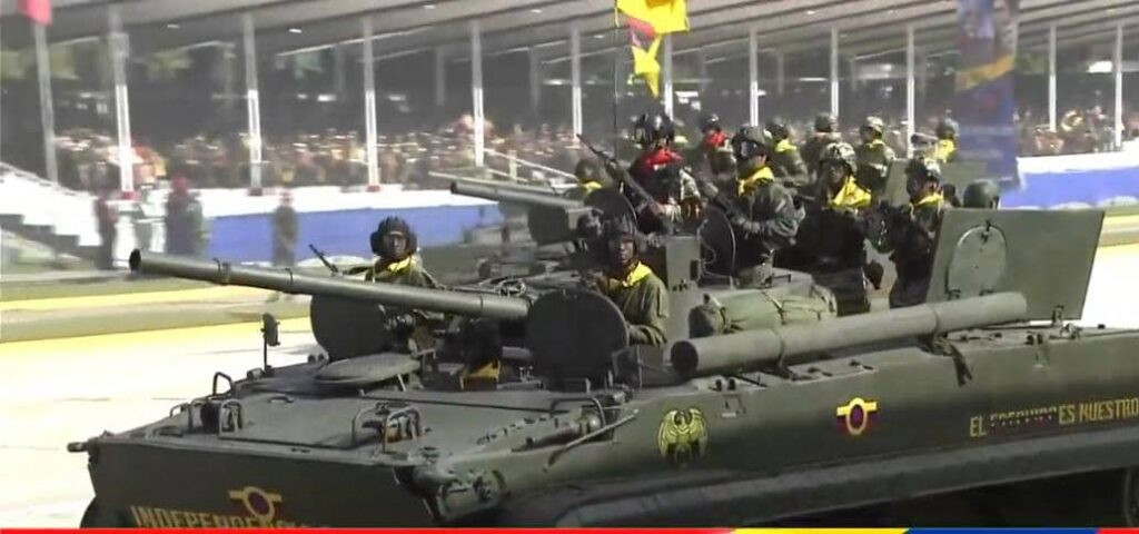 La parada militar en Caracas incluyó la participación de más de 14.000 efectivos. Entre los equipos destacados se observaron tanques, ametralladoras pesadas, sistemas anfibios, vehículos de combate de infantería BMP-3 y blindados BTR-80 con cañón de 30 milímetros, todos de origen ruso. También se presentó el mortero autopropulsado Nona-S, de 120 milímetros, y un sistema lanzacohetes capaz de disparar 40 proyectiles de 122 mm en solo 20 segundos, con un alcance de hasta 40 kilómetros.